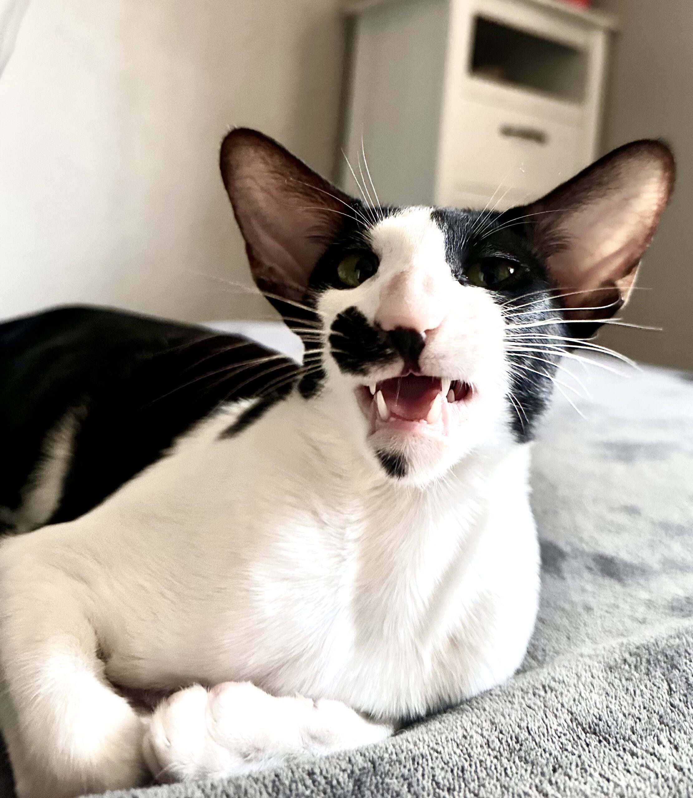 Calista Musa is one of the shining stars of Furriossa Cattery. With her striking black and white coat, long graceful body, and distinguished “Sicilian nose,” she embodies the dramatic elegance that makes Oriental Shorthairs so unforgettable.
