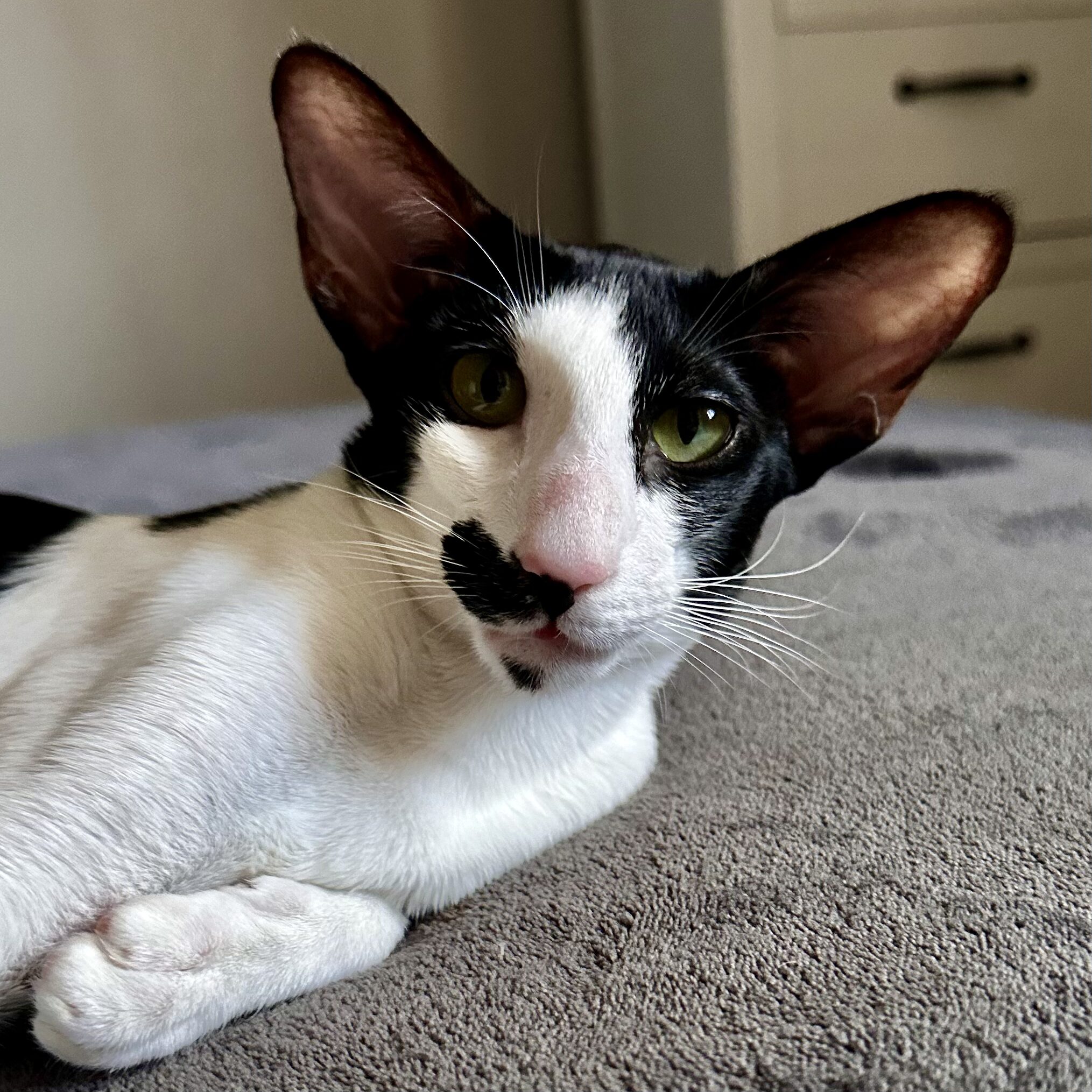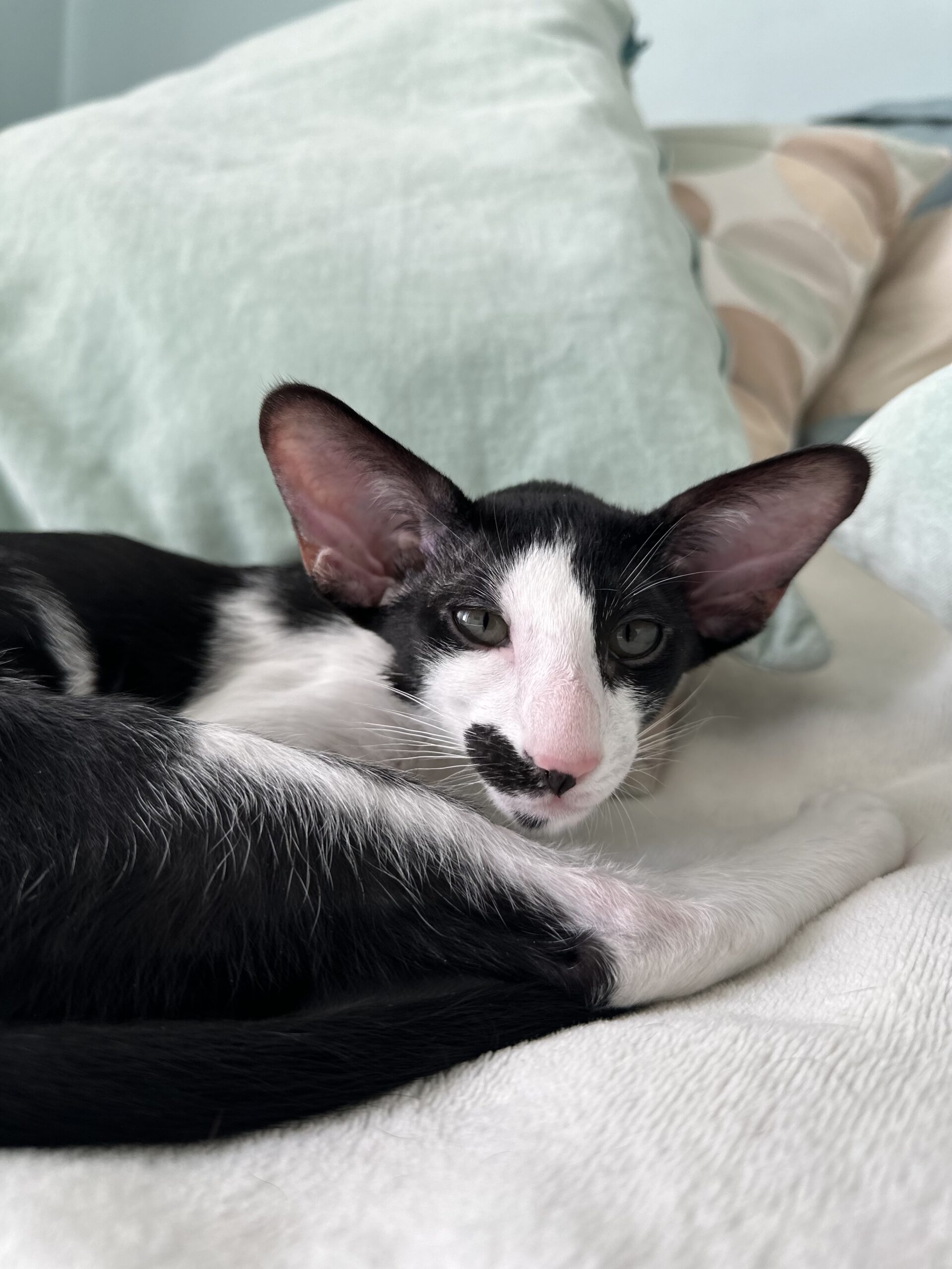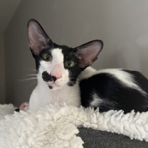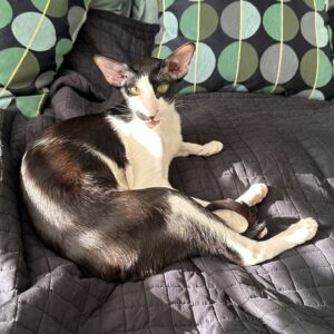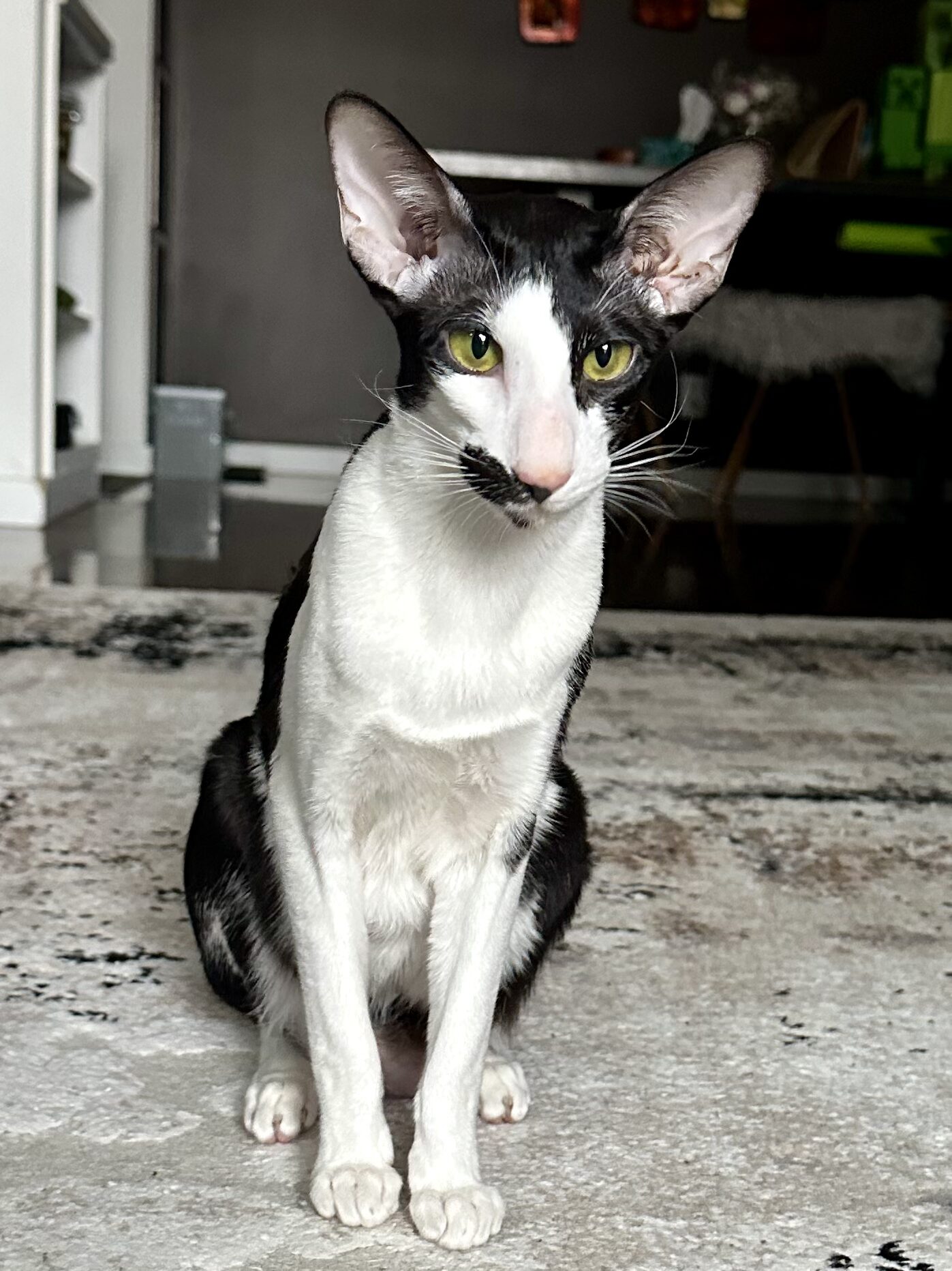 Calista Musa is one of the shining stars of Furriossa Cattery. With her striking black and white coat, long graceful body, and distinguished “Sicilian nose,” she embodies the dramatic elegance that makes Oriental Shorthairs so unforgettable.