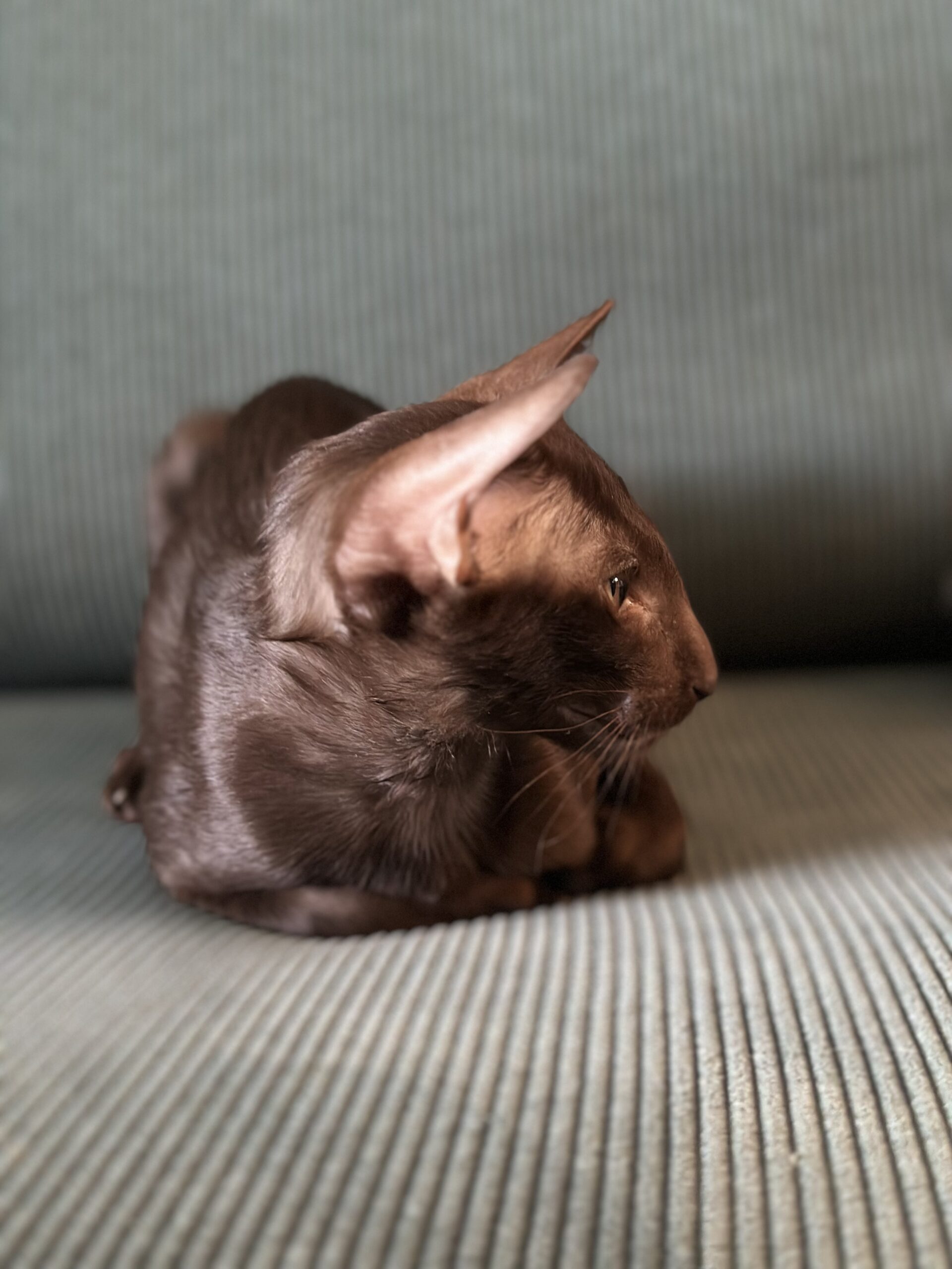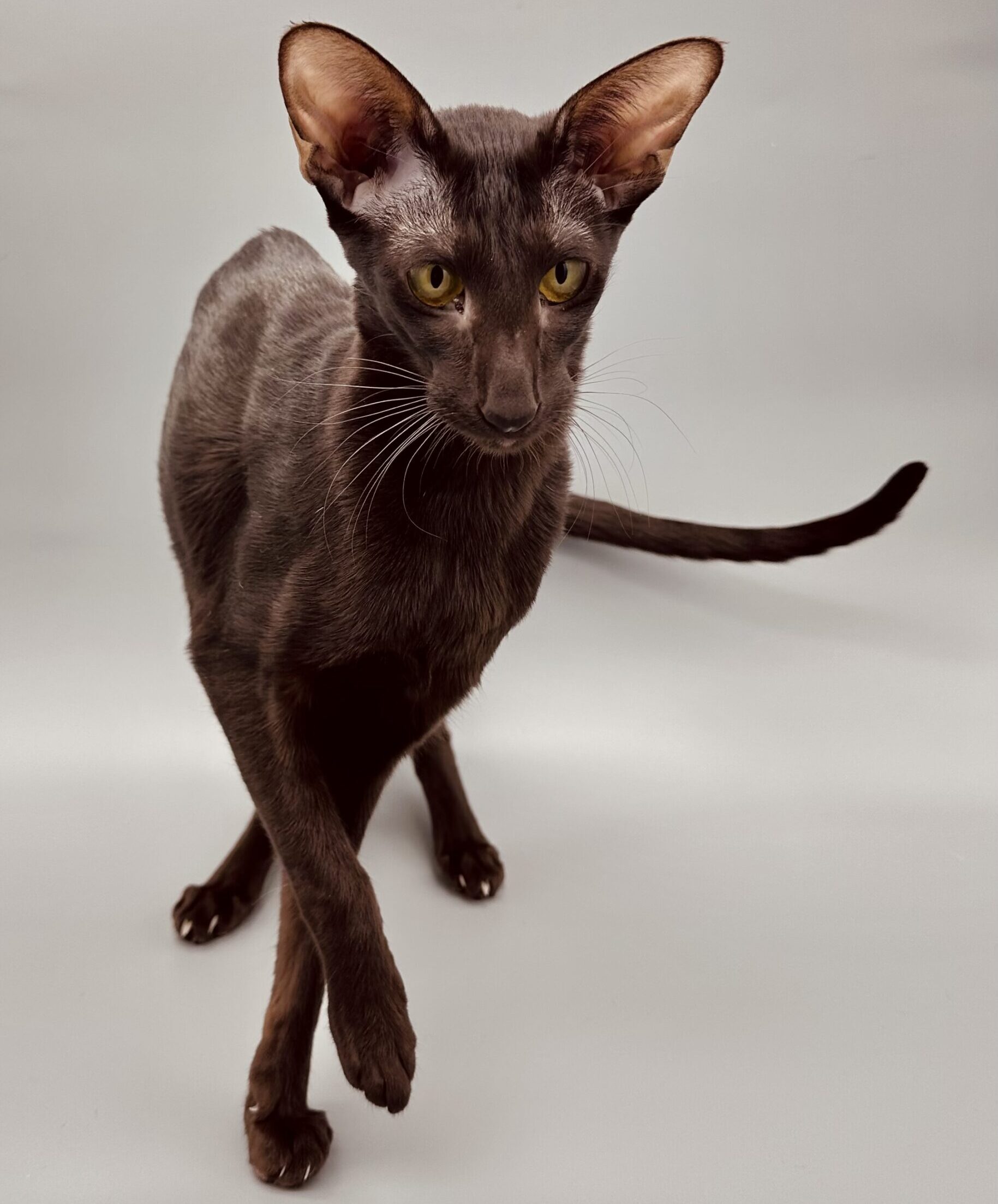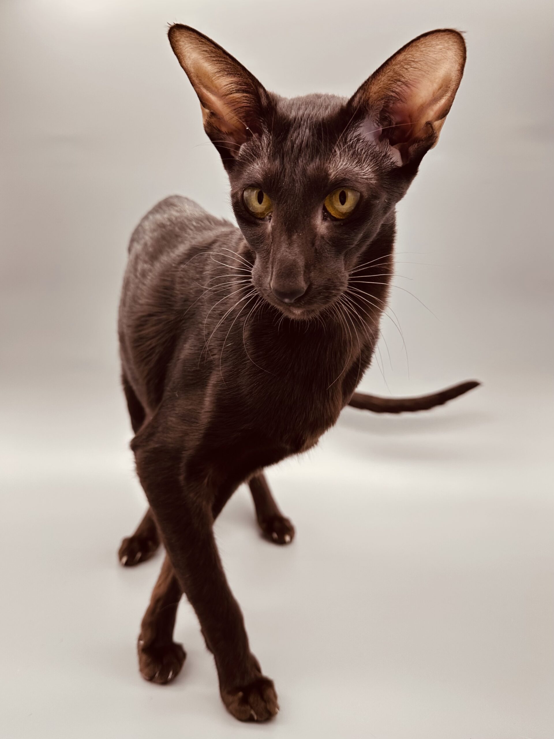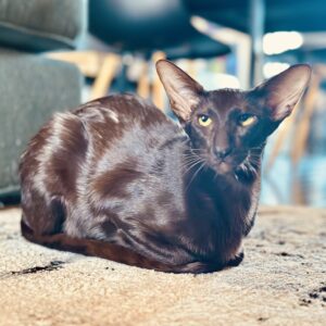 Eva Scarlett is elegance wrapped in chocolate silk. With her deep, glossy coat, long refined lines, and intense lime-golden eyes, she carries herself like true royalty.