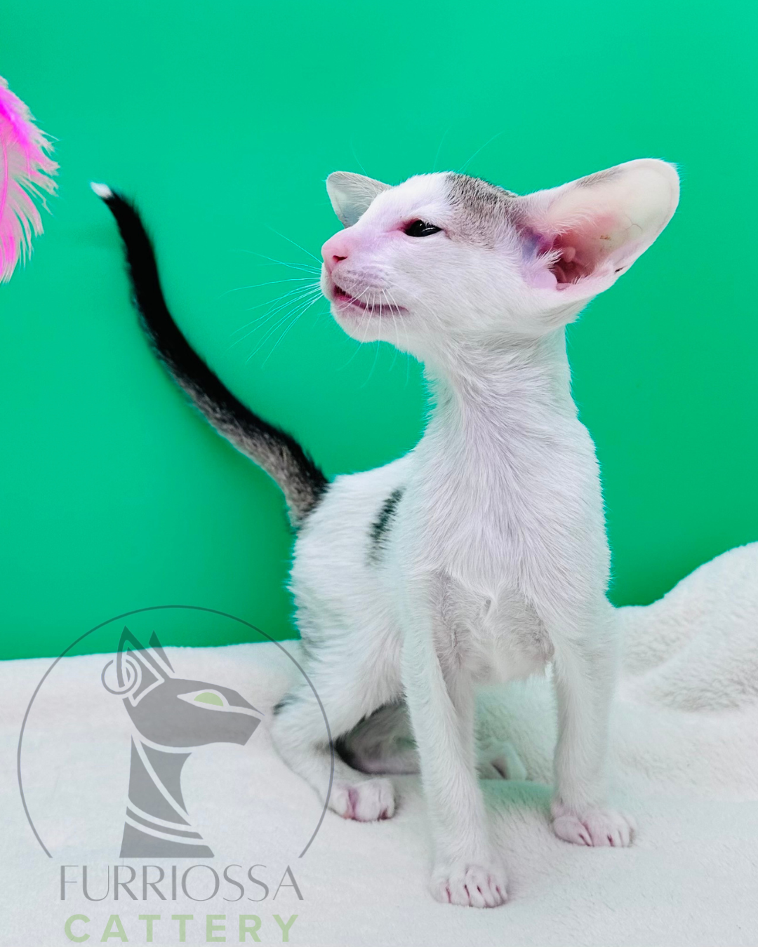 Galleria is a delicate and elegant little girl with a refined profile and beautifully large ears already defining her Oriental expression. Her soft contrast markings and graceful posture give her a very sophisticated look, even at a young age.