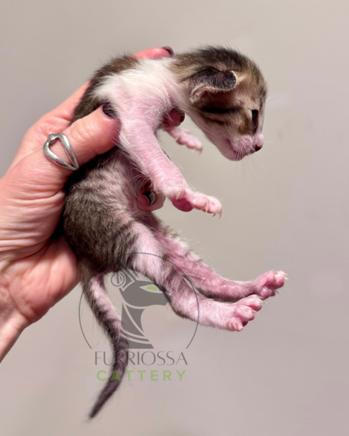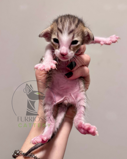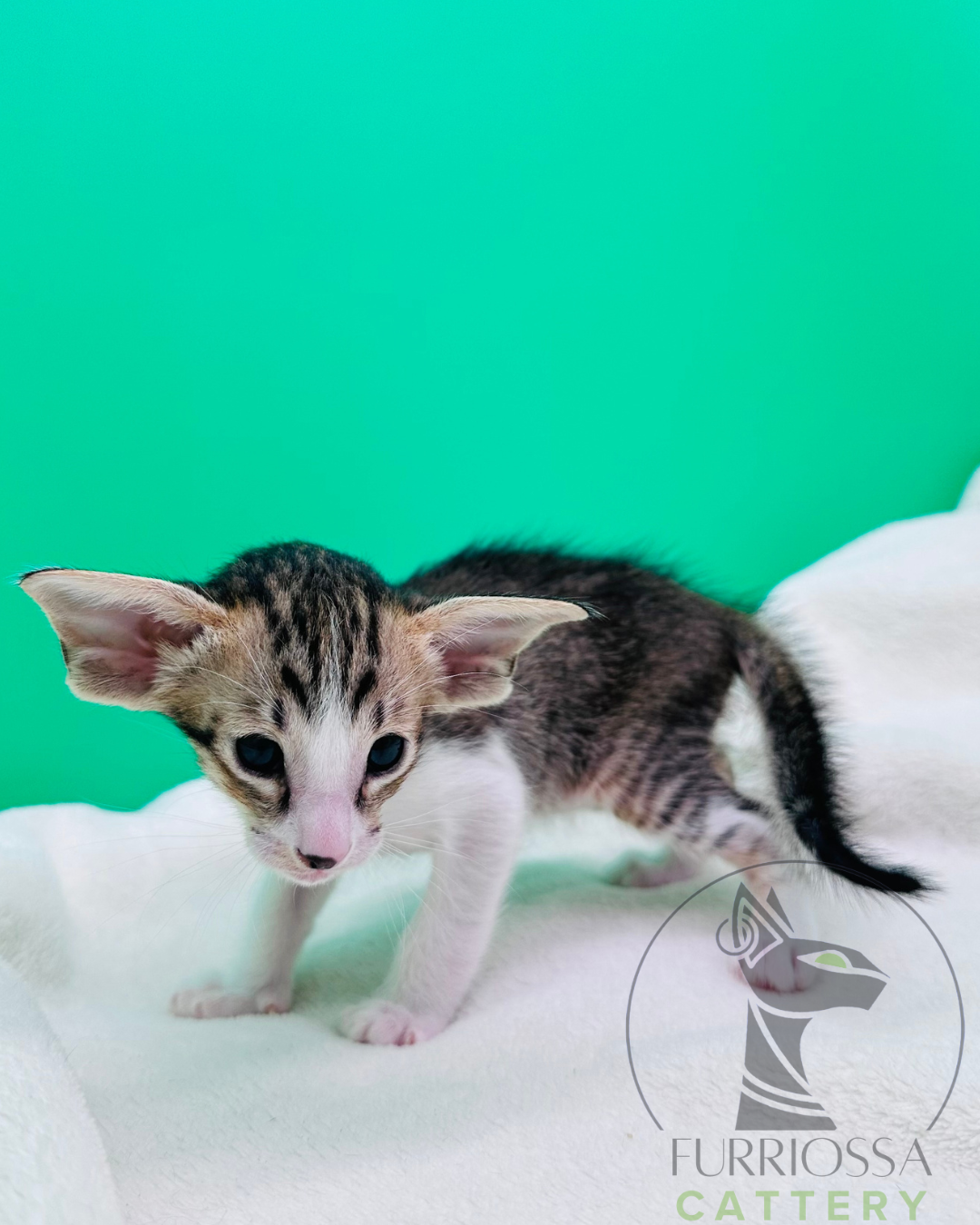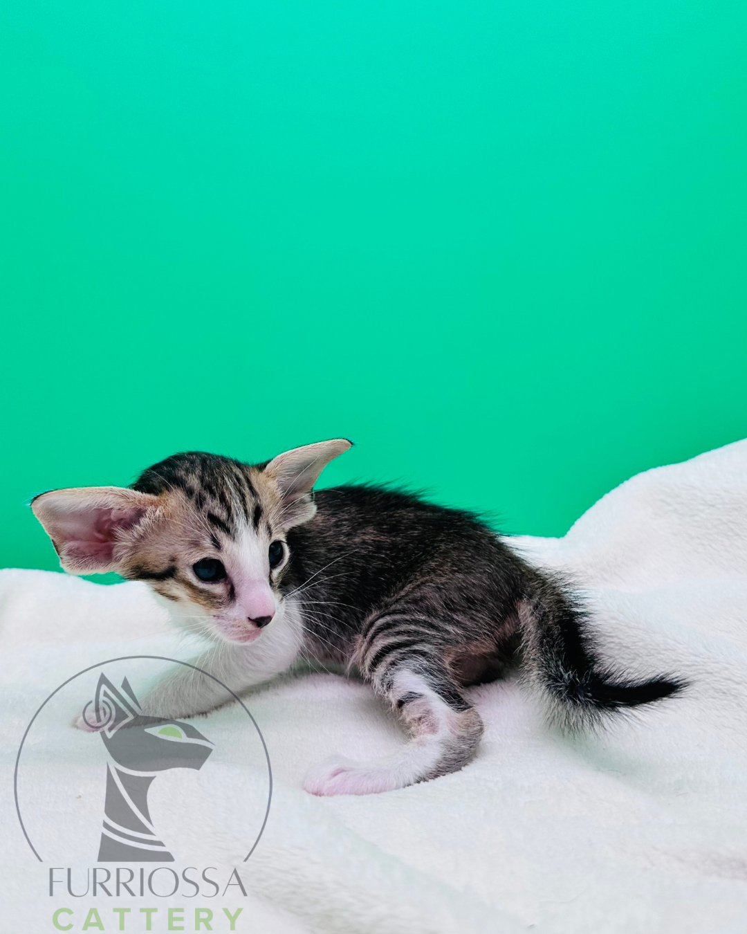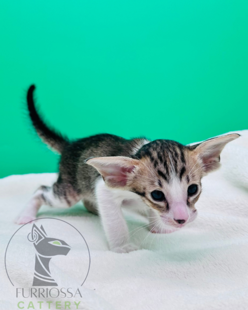 Iccon is a striking little boy with bold tabby markings and a beautifully refined Oriental profile. His large ears, expressive eyes, and elegant lines already give him a confident and distinctive look.