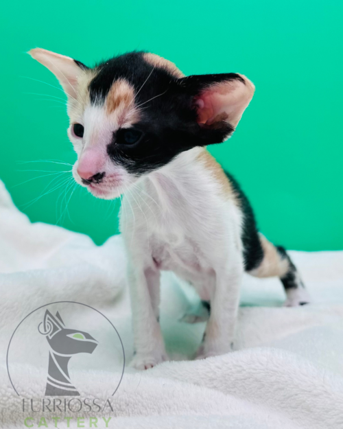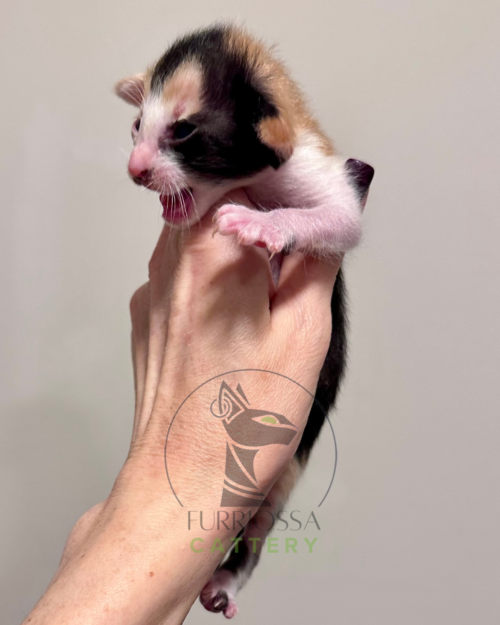 Infinniti is a striking black tortie & white girl with bold, artistic markings and beautiful contrast. Her expressive face and unique color placement make her instantly unforgettable.