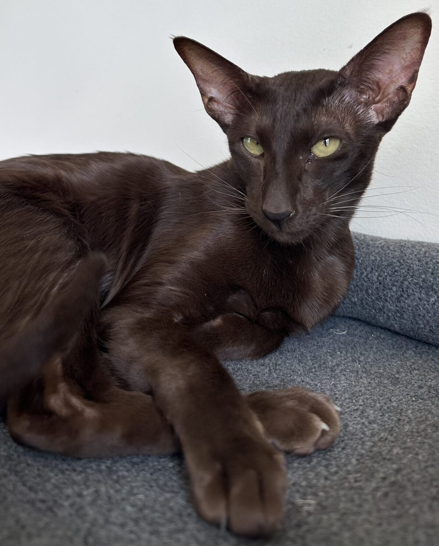 Yolandi holds a very special place in our hearts as the very first queen of Furriossa Cattery. A stunning chocolate Oriental Shorthair, she is the foundation of our breeding program and the proud mother of four beautiful litters.